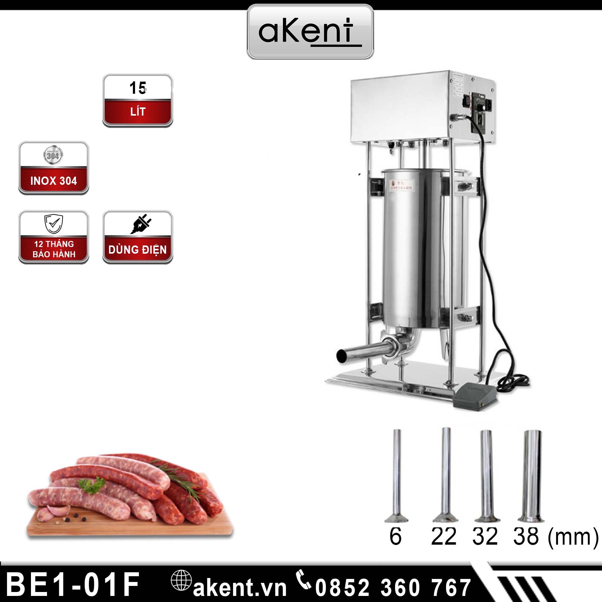 Máy đùn xúc xích tự động 15l có 5 cỡ ống đùn: 10mm, 15mm, 25mm, 30mm, 35mm phục vụ các nhu cầu đa dạng của người dùng. Ngoài việc sử dụng để làm xúc xích, máy còn được ứng dụng để làm lạp xưởng, nem,…